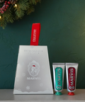 冬の冷たい空気を思わせるクールなクラシック ストロング・ミントと、ほのかな甘みがあるスパイシーなシナモン・ミントのフレーバーの組み合わせは、ホリデーシーズンにおすすめです。ツリーをイメージしたシルバーのボックスは、MARVISのロゴが入った赤いリボンが取っ手になっており、プレゼントにも最適なアイテムです。